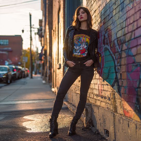 A vintage-style Looney Tunes ensemble tee featuring Bugs Bunny or Tweety Bird paired with a classic black leather jacket and skinny jeans creates edgy nostalgia.