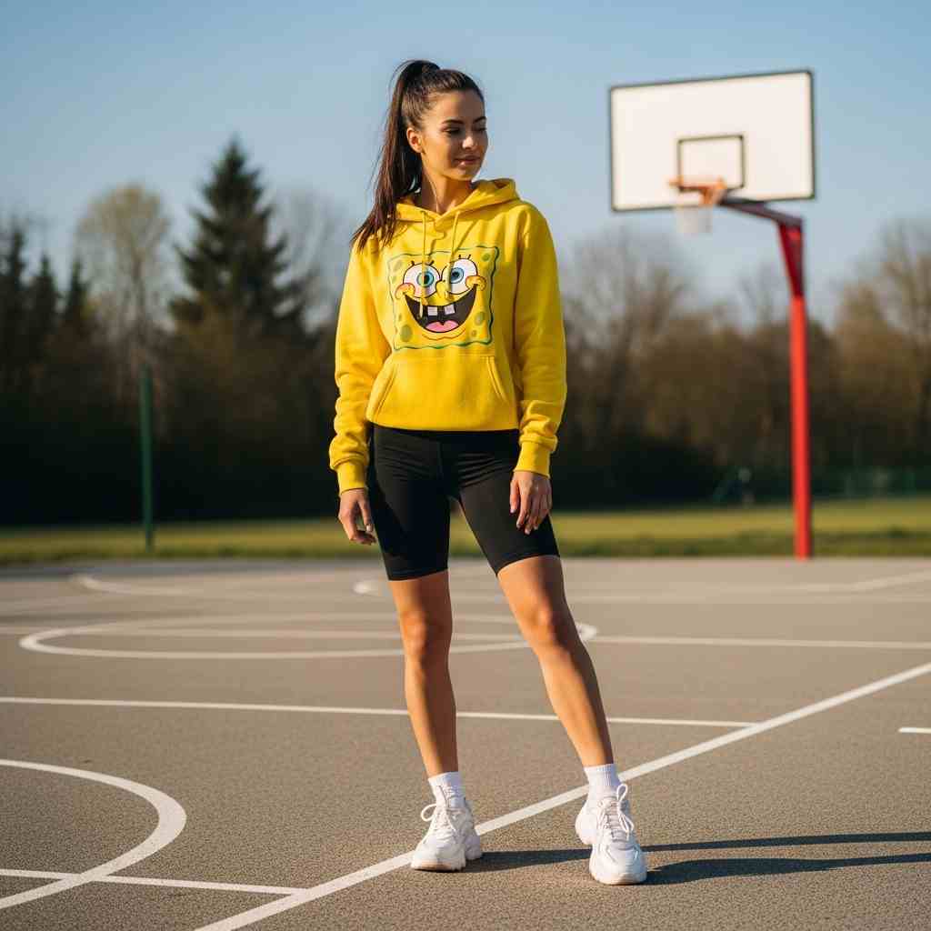 A bright yellow hoodie featuring SpongeBob graphics paired with black bike shorts and chunky sneakers embraces the athleisure trend with cartoon fun.