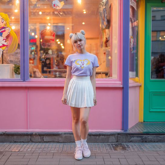 A pastel tee featuring Sailor Moon graphics tucked into a pleated midi skirt channels magical girl energy with feminine romance.