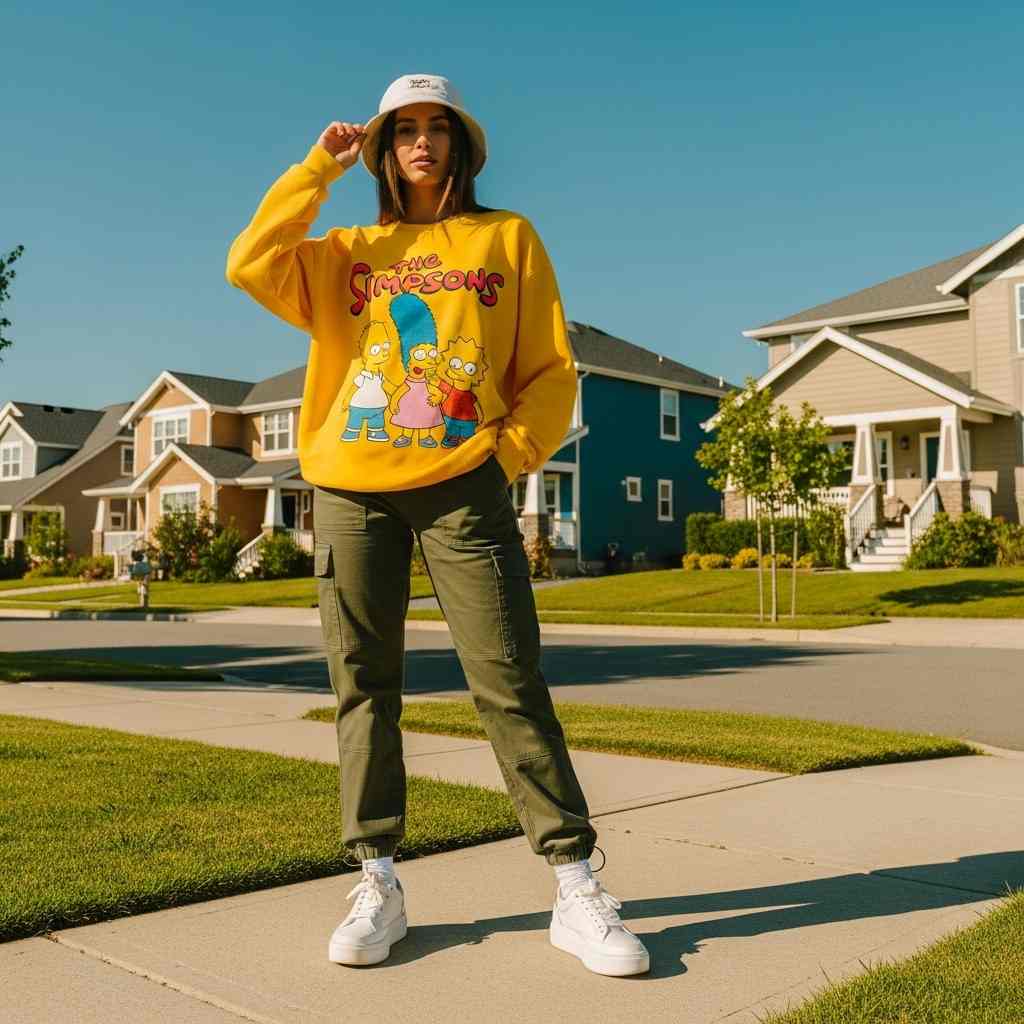An oversized sweatshirt featuring The Simpsons family logo paired with relaxed cargo pants and platform sneakers creates a ’90s-inspired casual look.