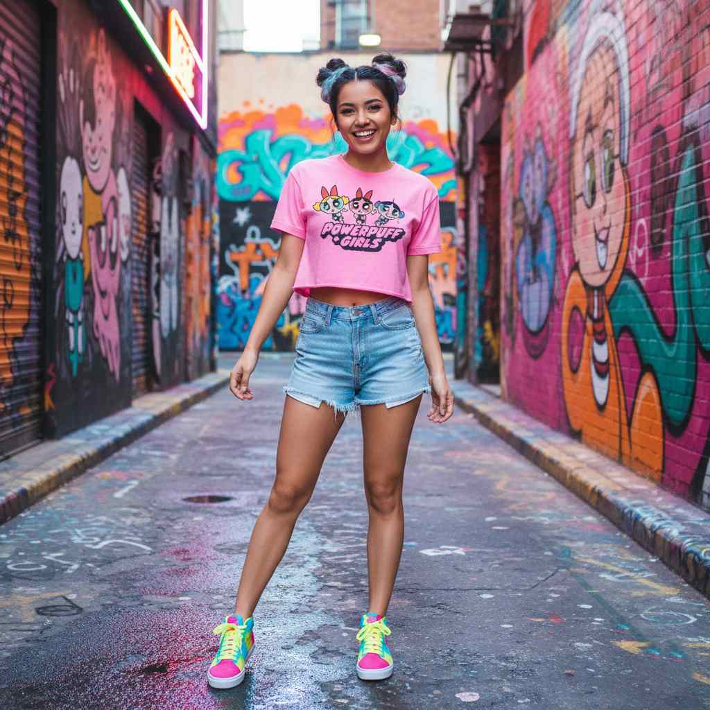 A cropped tee featuring the Powerpuff Girls logo paired with high-waisted denim shorts and colorful sneakers captures girl-power vibes.