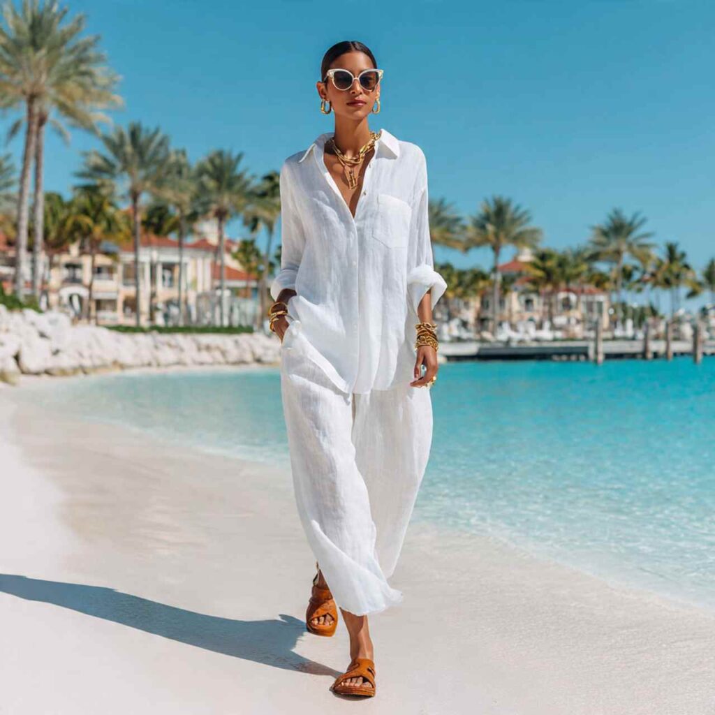 Matching white linen pants and an oversized button-down shirt create instant sophistication. Leave the shirt partially unbuttoned, roll the sleeves to three-quarter length, and add tan leather sandals. The all-white palette reflects heat while looking incredibly chic.