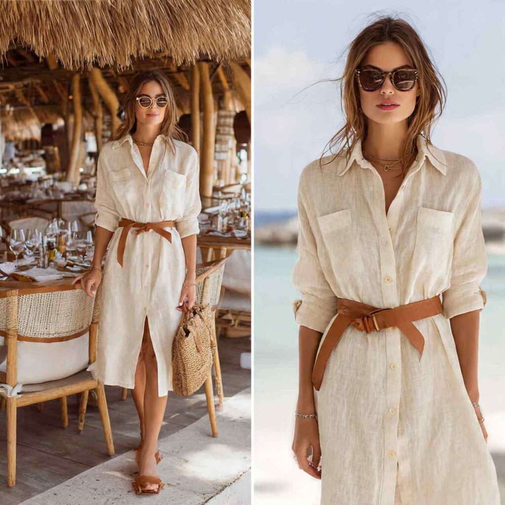 A shirt dress in natural linen knee-length or midi creates effortless sophistication. Wear it belted to define the waist or loose for ultimate comfort. Add leather sandals and a woven bag.