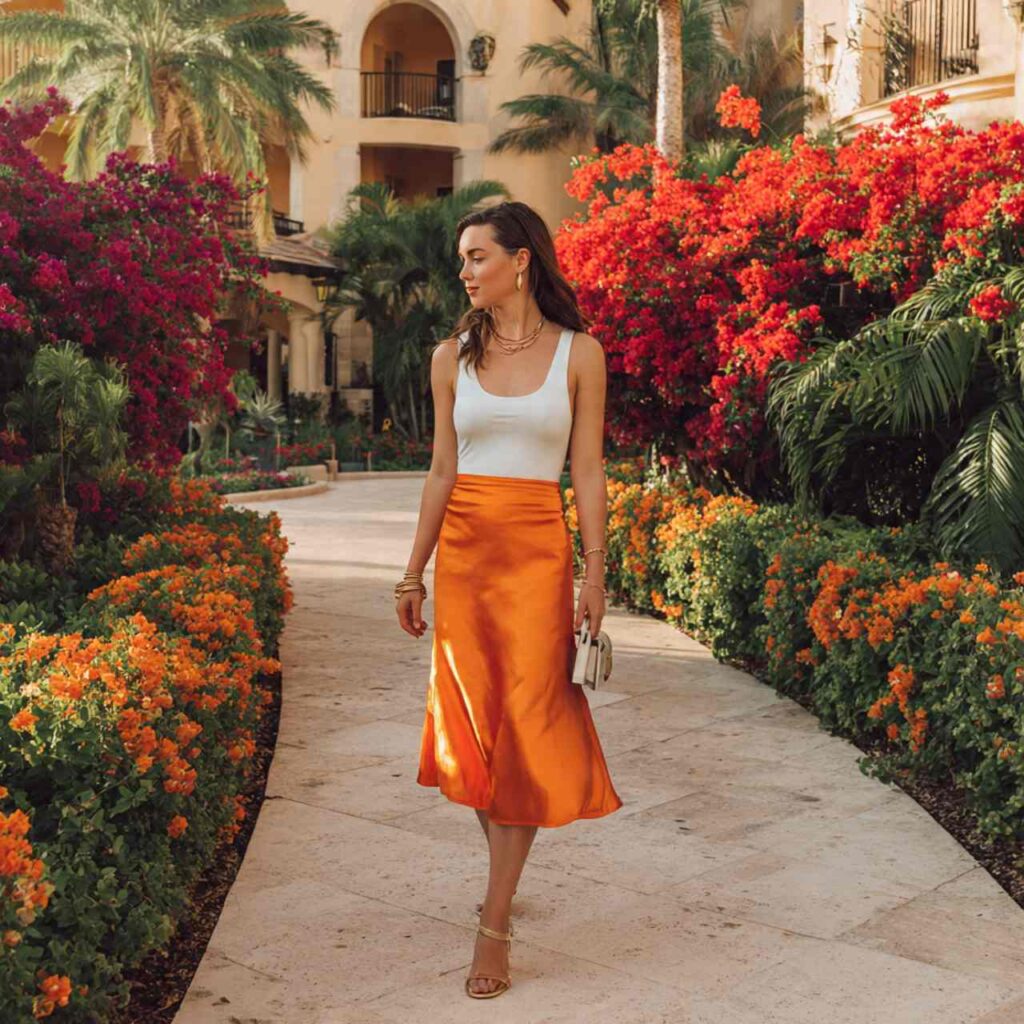 A flowy midi skirt in a bold print or solid tropical color paired with a simple white tank or tee creates balanced elegance. The white top keeps attention on the skirt while remaining appropriate for warm weather.