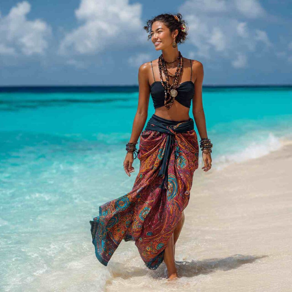 A large printed sarong wrapped as a skirt paired with a simple bikini top or tank creates versatile beach-to-anywhere styling. Choose a quality sarong in beautiful colors and learn different wrapping techniques.