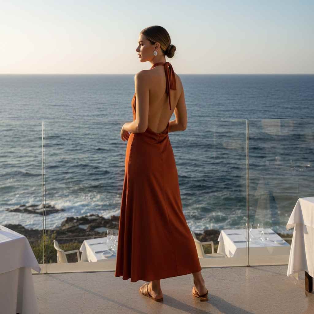 A halter-neck dress in a solid colorโemerald, navy, or rustโelongates the neck and shows off sun-kissed shoulders. Choose a midi length and flowing fabric. Add simple sandals and let the neckline be the star.