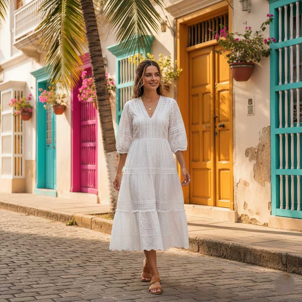 A white eyelet dress with delicate embroidery creates textural interest and feminine charm. The cutwork details add visual interest while the white keeps it fresh and appropriate for tropical heat.