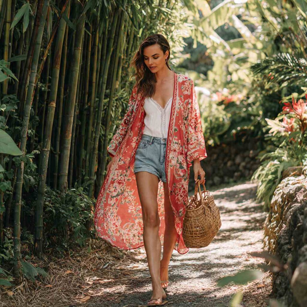 A lightweight printed kimono worn open over a simple tank and denim shorts creates layered interest. The kimono adds elegance and can double as a beach cover-up or dinner layer.