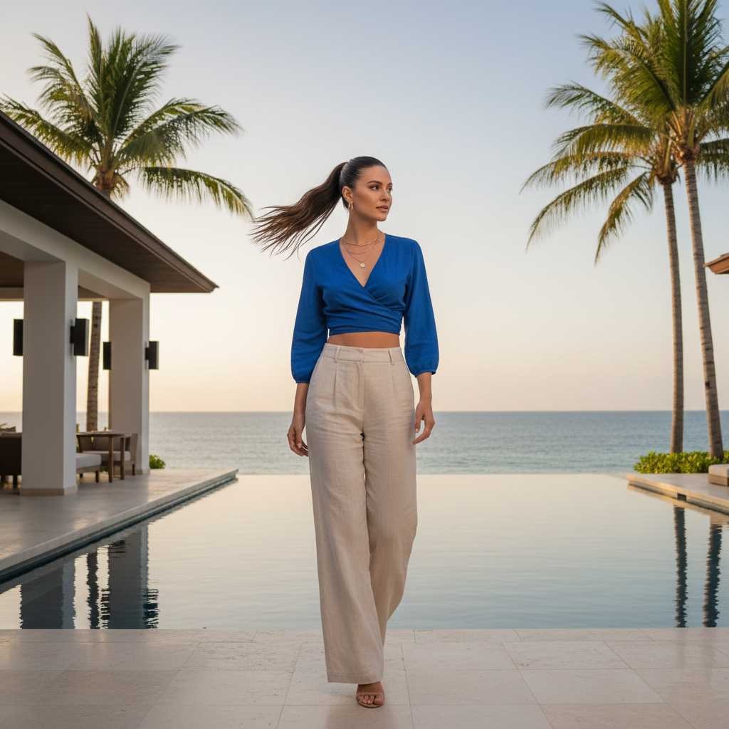A wrap-style crop top or blouse in a bold color paired with natural linen pants creates contemporary elegance. The wrap detail is flattering and the combination is both comfortable and chic.