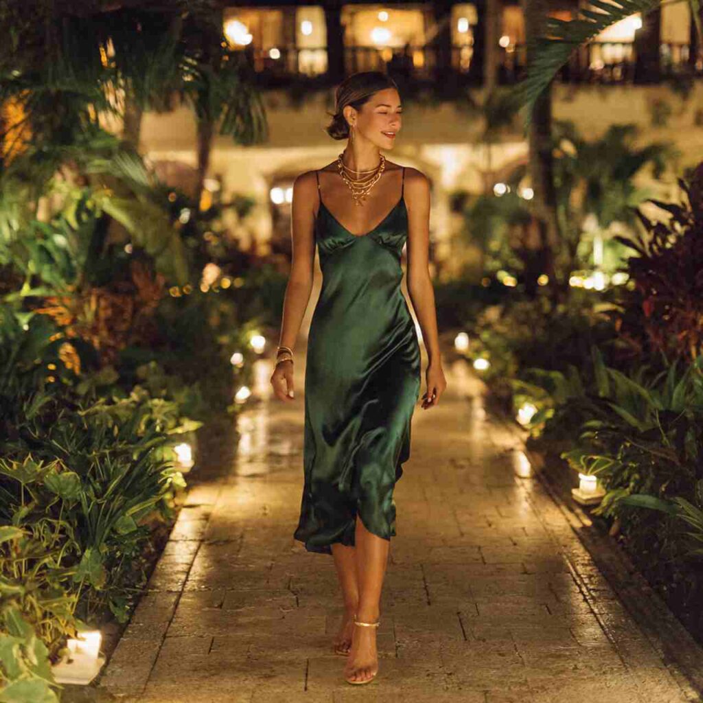 A midi-length silk slip dress in a jewel tone emerald, sapphire, or sunset orange brings evening elegance to the tropics. The delicate straps and flowing fabric feel luxurious while the length keeps it classy.