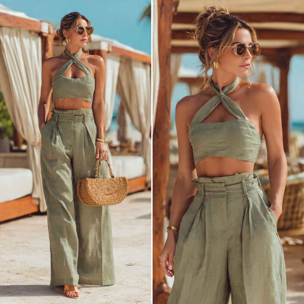 A matching crop top and high-waisted skirt or pants set in linen or cotton creates coordinated sophistication. Choose tropical colors or neutral tones. The matching nature makes it look more polished than separates.