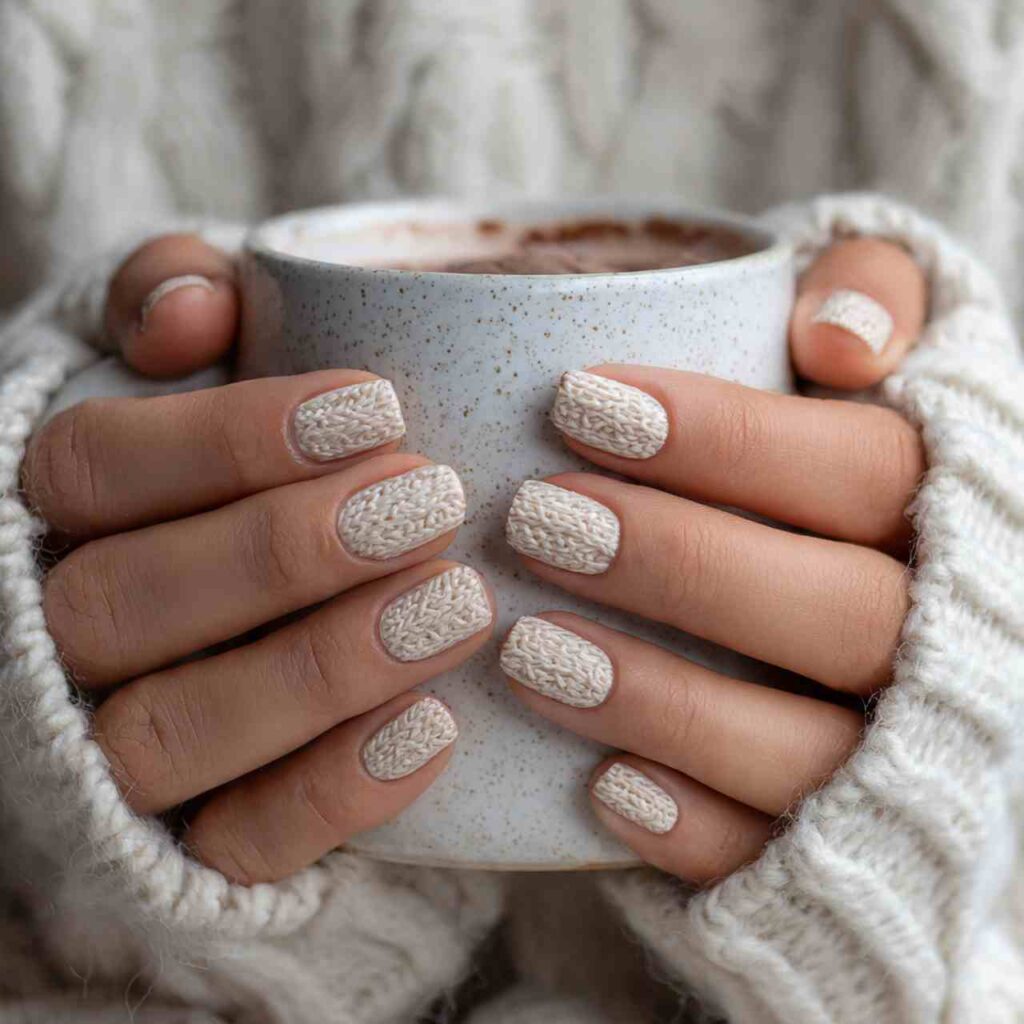 3D textured nail art mimicking cozy knit sweaters creates tactile adorableness. The raised cable-knit pattern brings winter coziness to your fingertips.