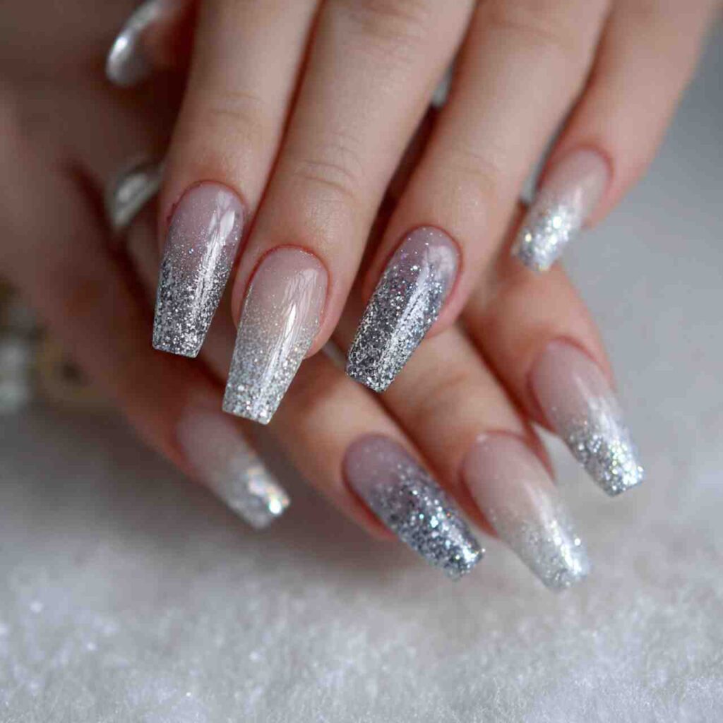 Glitter concentrating at tips fading toward cuticle creates sparkly sophistication. The gradient prevents overwhelming glitter while maintaining festive shimmer.
