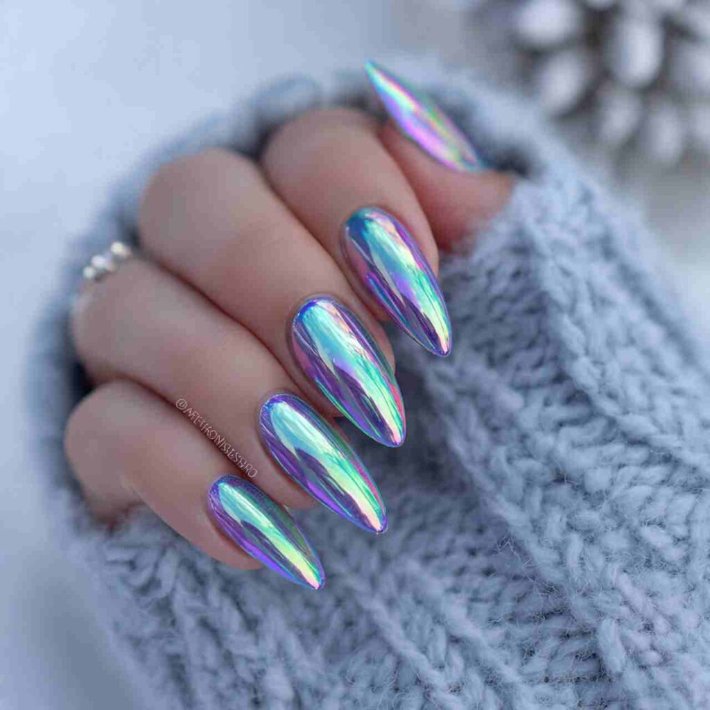 Iridescent chrome creating northern lights effect offers magical winter aesthetic. The color-shifting quality mimics aurora’s ethereal beauty on your nails.