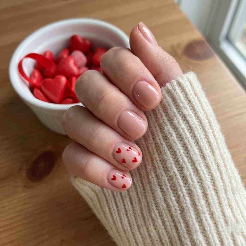 Small hand-painted hearts on neutral base creates sweet romanticism. The minimal cute detail adds personality without complexity.