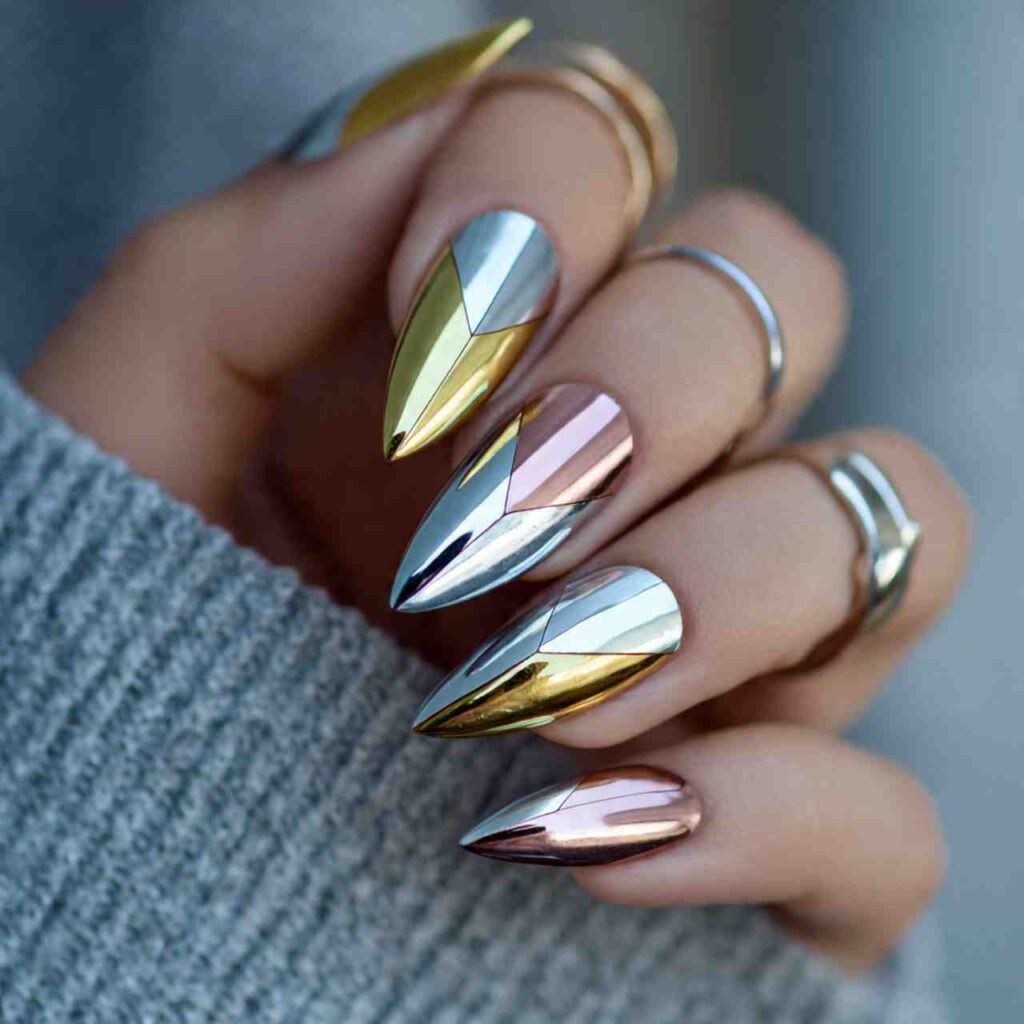 Geometric color blocking using metallic shades creates modern boldness. The combination of colors and metallic finish delivers fashion-forward impact.