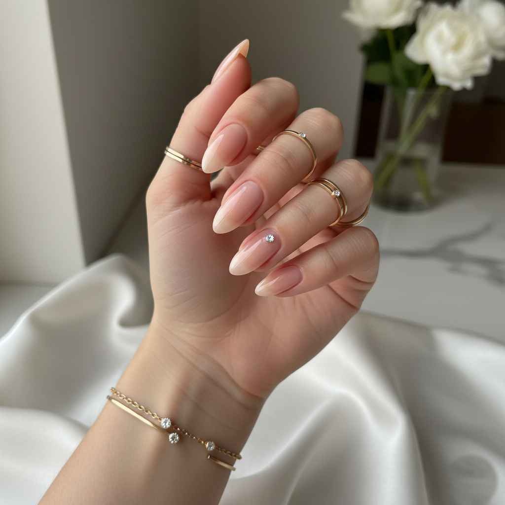 Nude base with single rhinestone or gem on each nail creates understated luxury. The minimal embellishment adds just enough sparkle.
