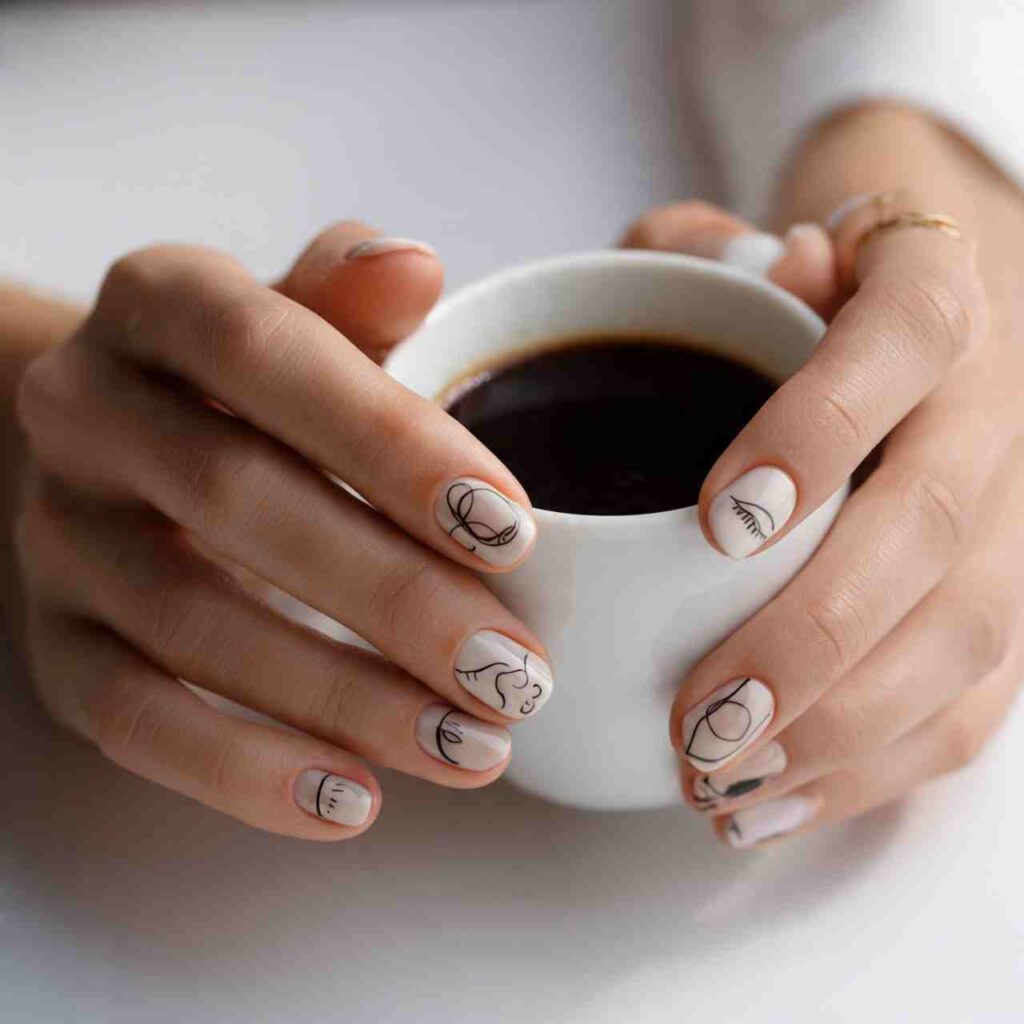 Delicate thin black lines creating abstract designs on nude base offers modern sophistication. Simple line drawingsโ€”faces, flowers, geometric shapesโ€”create artistic impact with minimal complexity.