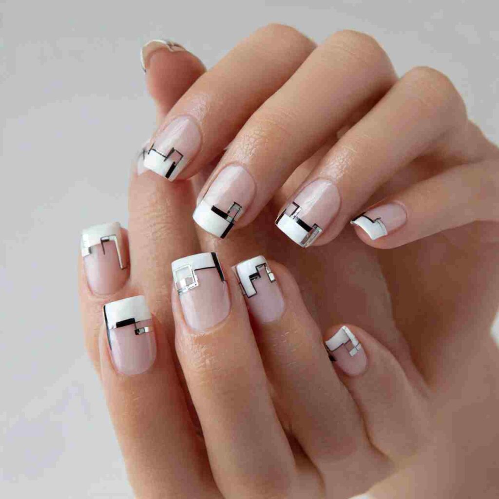 Modern French manicure using negative spaceโ€”clear sections creating geometric patterns at tips creates contemporary twist on classic. The updated technique feels fresh and current.