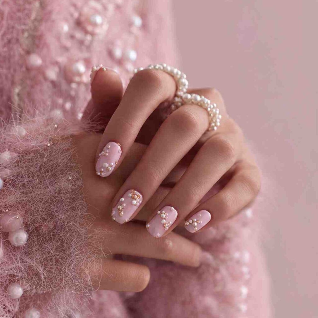 Tiny pearl accents on nude or pastel base creates feminine elegance. Strategic pearl placement adds dimensional detail without overwhelming.