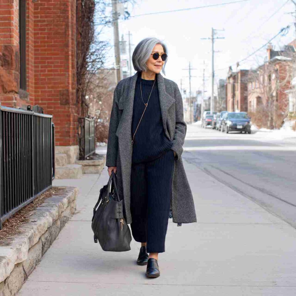 A matching ribbed knit set—pants and long-sleeve top—in navy paired with gray wool coat creates coordinated comfort. The set’s cohesion looks intentionally elegant.