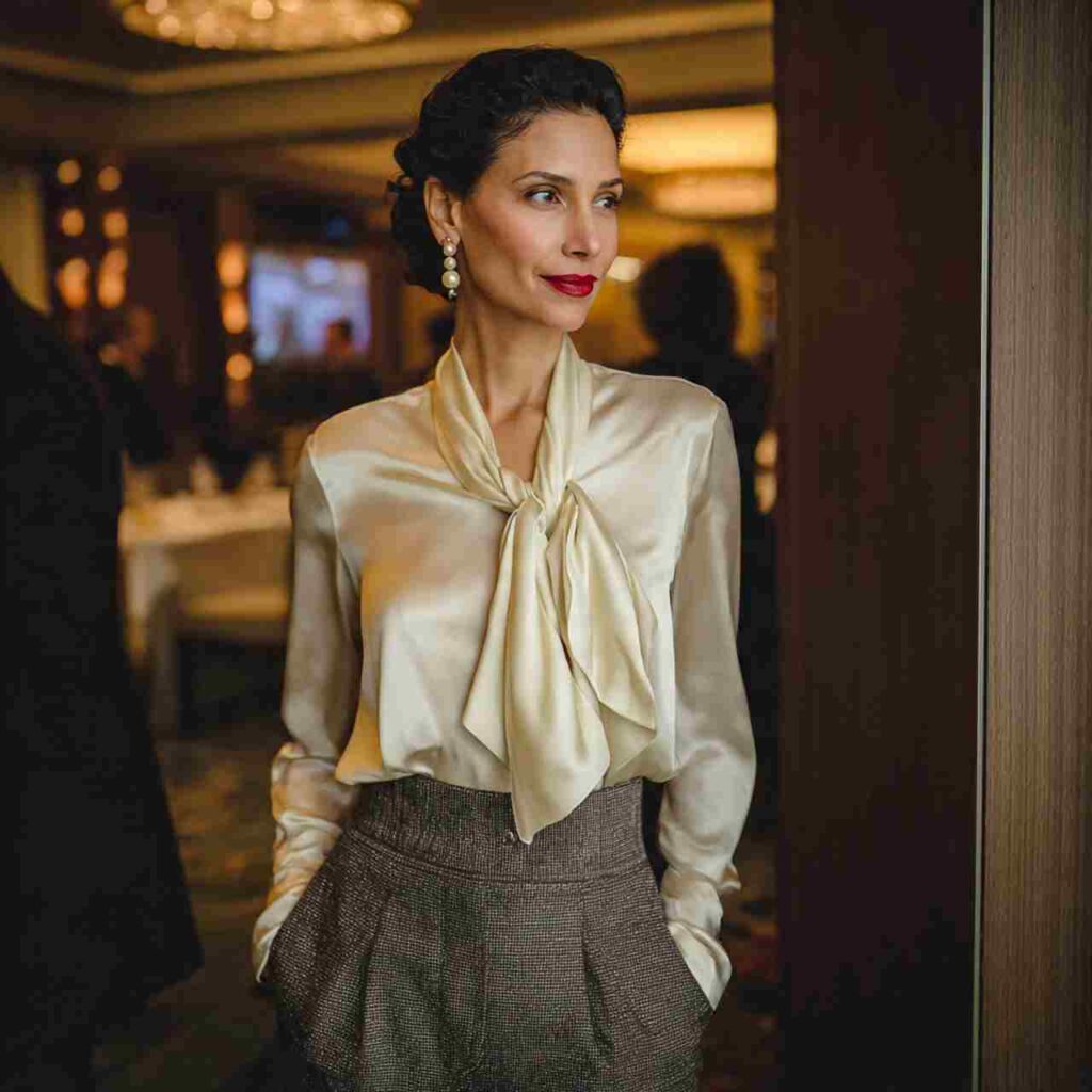 A cream silk blouse with subtle sheen tucked into gray wool trousers creates textural sophistication. The fabric contrast adds visual interest while maintaining professionalism.