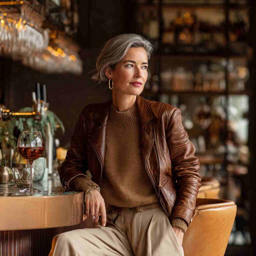 A quality leather jacket in brown worn over cashmere sweater and tailored trousers creates soft-meets-structured appeal. The leather adds edge to refined basics.