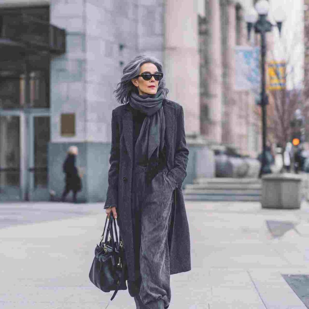 Head-to-toe gray—light gray sweater, charcoal trousers, medium gray coat—creates sophisticated tonal dressing. The gray gradient feels modern and intentionally curated.