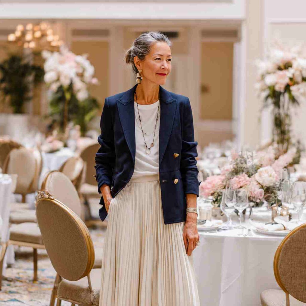 A pleated skirt in navy paired with coordinating blazer over simple white tee creates feminine suiting alternative. The pleats add movement while maintaining professionalism.
