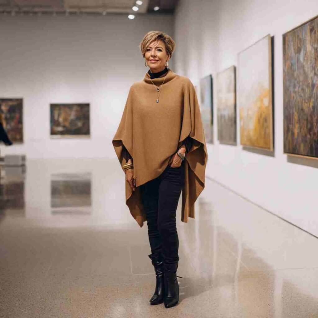 A cashmere poncho in camel worn over slim black pants and turtleneck creates relaxed sophistication. The poncho provides warmth without bulk.