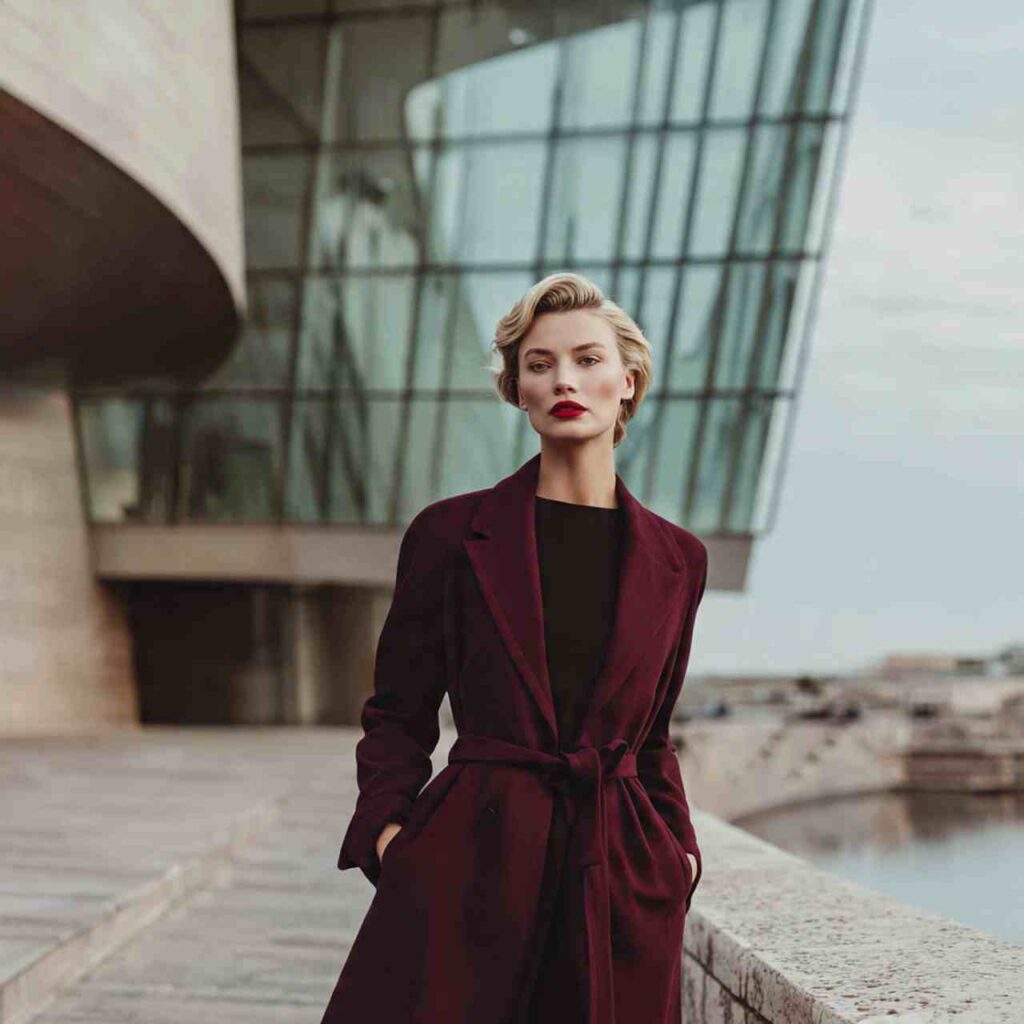 A wrap-style wool coat in deep burgundy over simple black basics creates statement outerwear elegance. The coat’s structure and color provide all necessary interest.