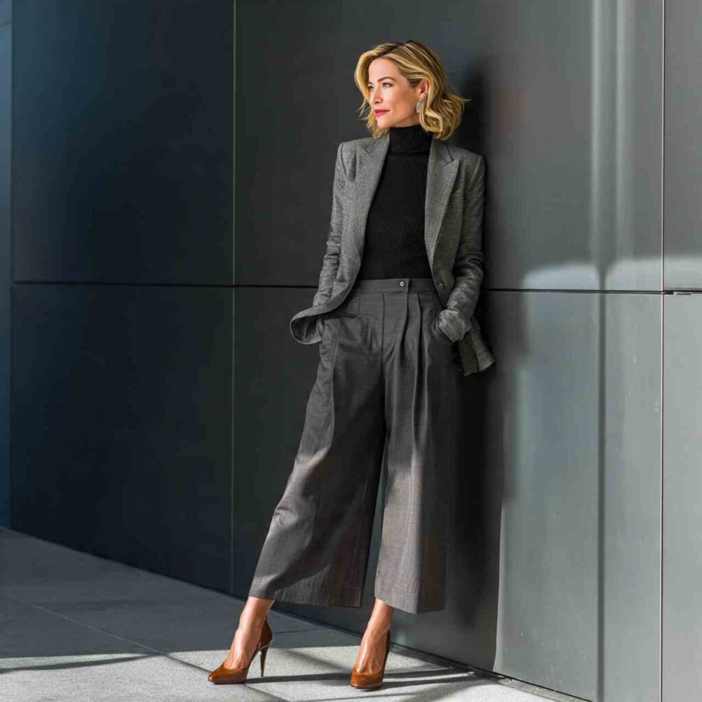 A fine-knit black turtleneck layered beneath a gray wool blazer paired with wide-leg trousers creates polished professional elegance. The proportion play flatters while maintaining sophistication.