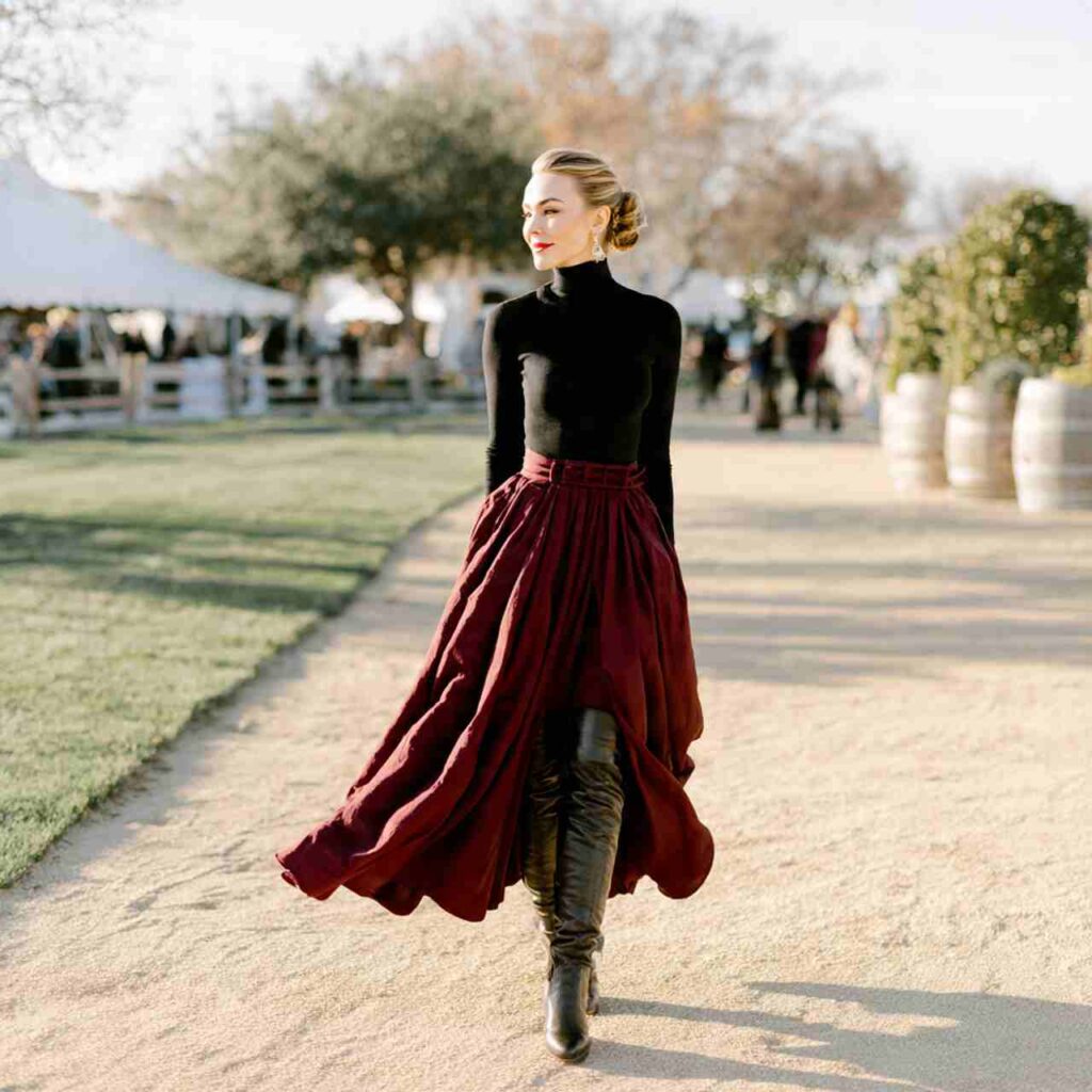 A flowing midi skirt in burgundy paired with black turtleneck and knee-high boots creates feminine sophistication. The covered-up elegance feels appropriate and graceful.