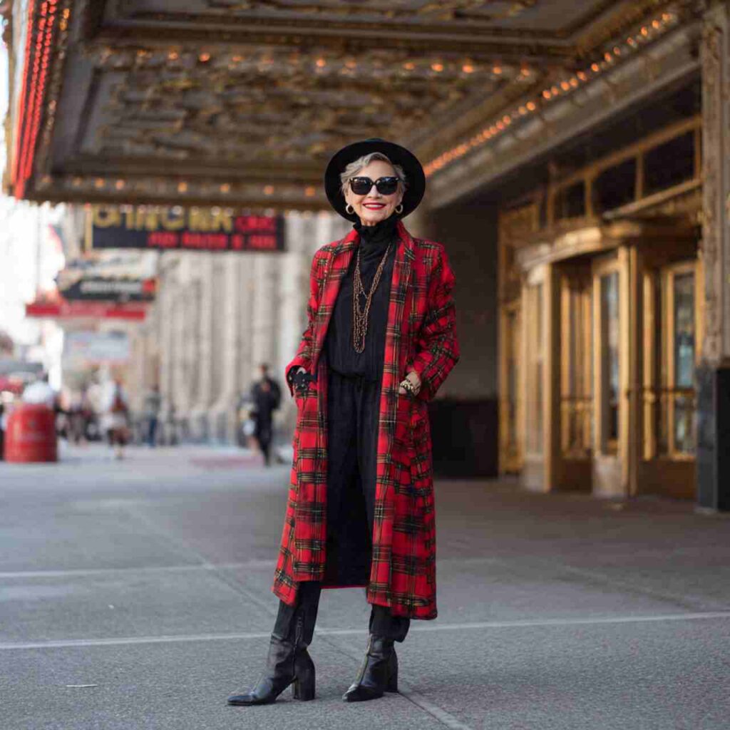 Simple all-black foundation—turtleneck and trousers—elevated by a statement coat in plaid or bold color creates modern elegance. The coat becomes the outfit’s focal point.