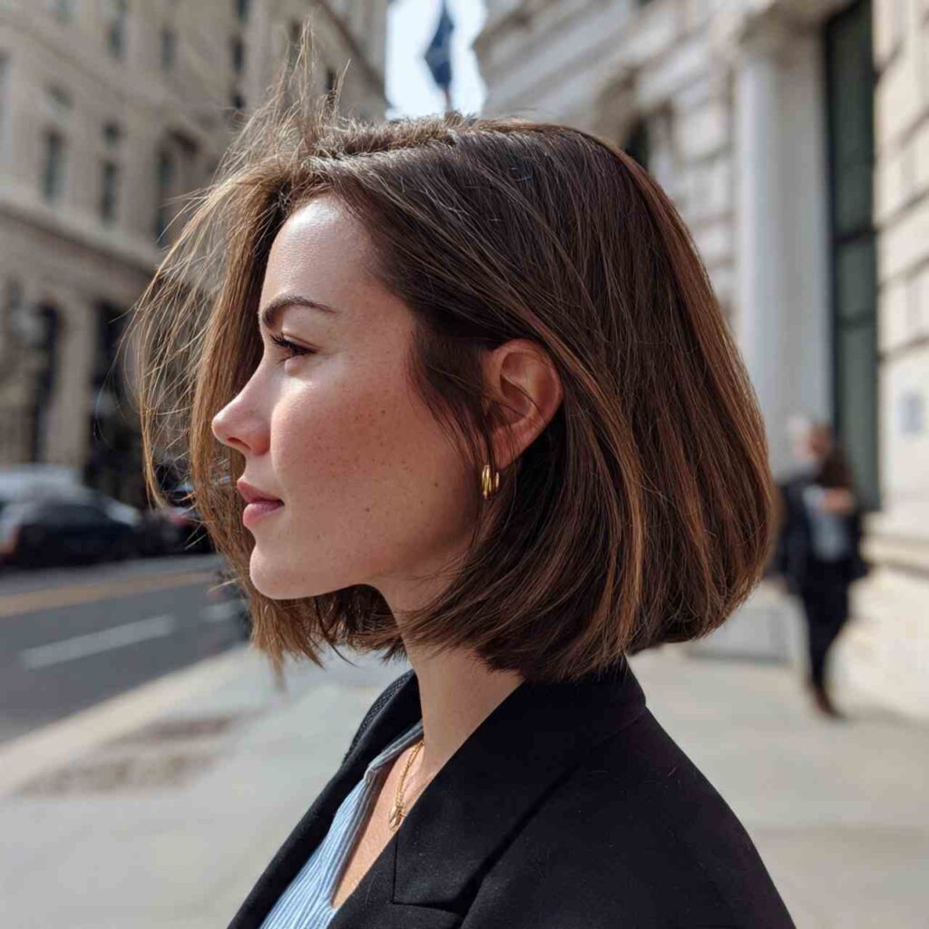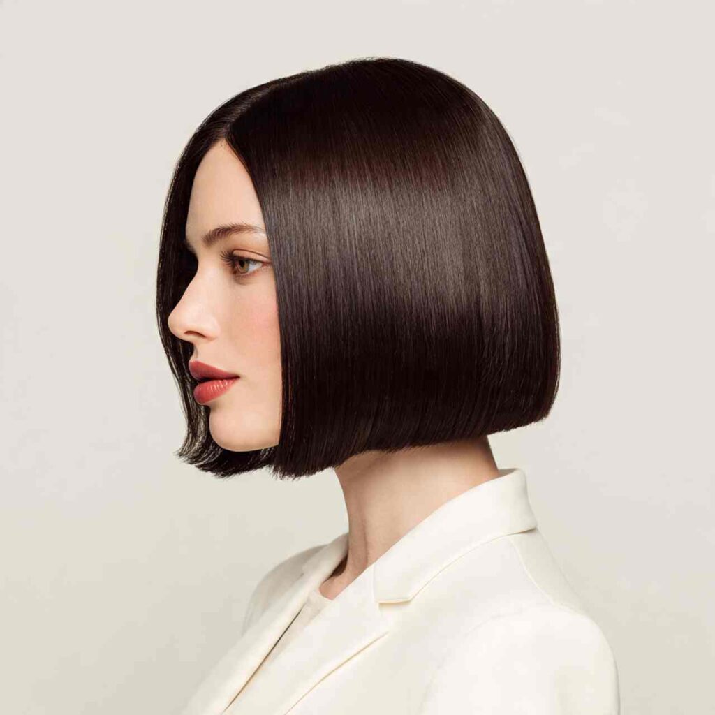 A straight-across cut precisely at jaw length creates timeless sophistication. This clean, architectural line frames the face beautifully while maintaining simplicity that never goes out of style.