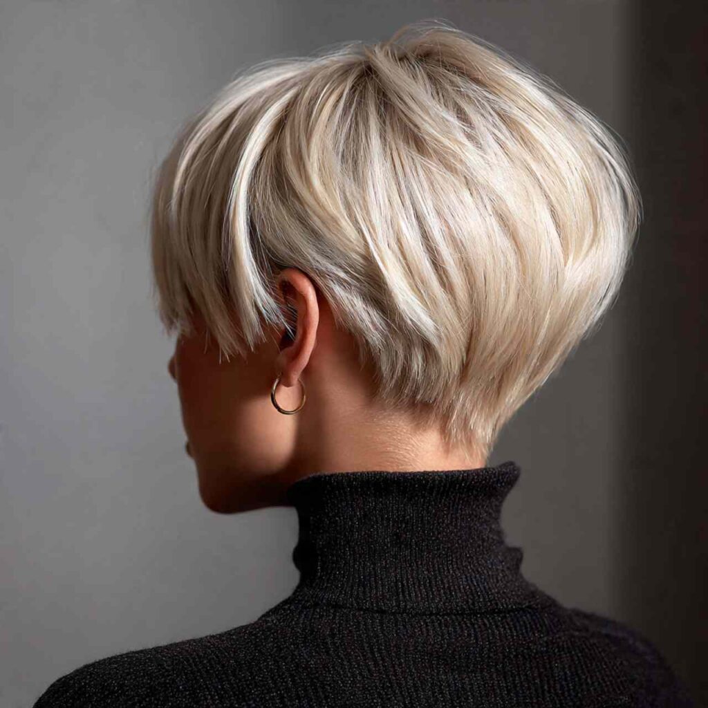 Shorter back revealing nape creates cool-girl edge with front length maintained. This modern take adds unexpected detail while keeping face-framing length.