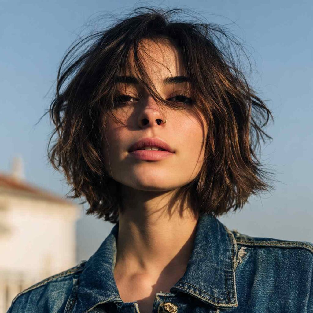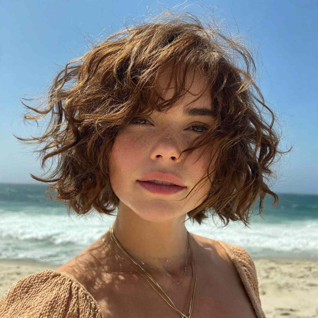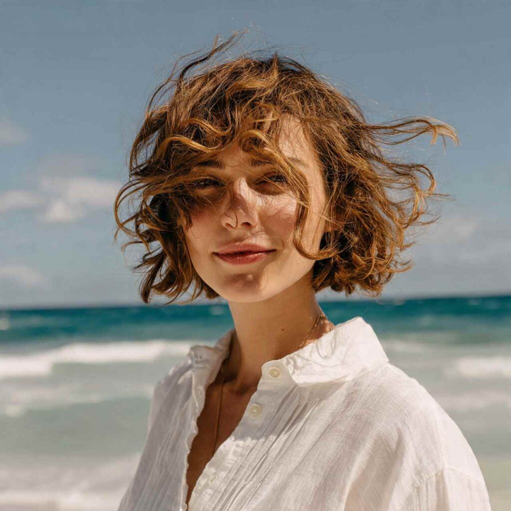 Intentionally messy bob with beachy texture creates effortless appeal. This undone look captures vacation vibes with low-maintenance styling.