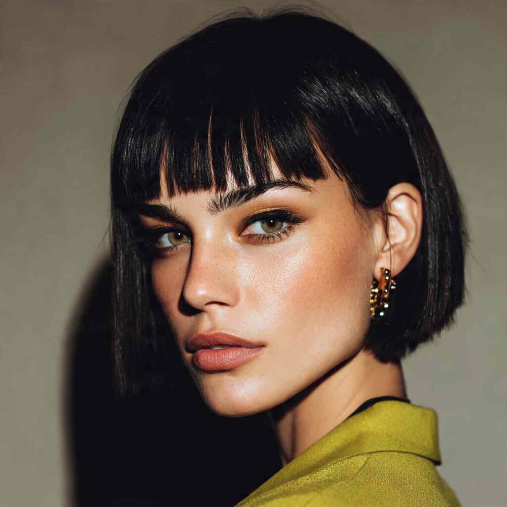 Jaw-length blunt cut paired with short straight-across bangs creates edgy fashion-forward impact. This bold combination makes a statement while remaining surprisingly wearable.