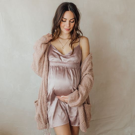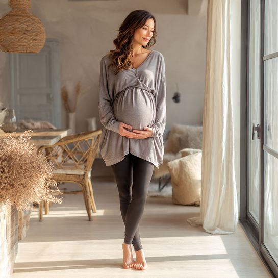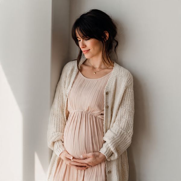 Ribbed stretch fabric hugs the bump gently, while a cardigan adds warmth for breezy mornings.