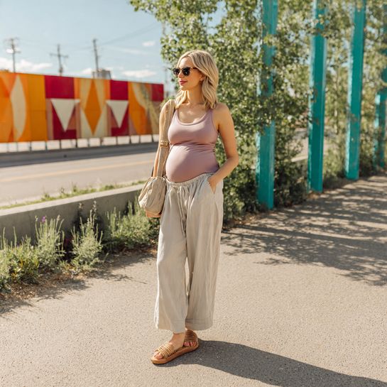 A wrap dress adjusts easily as your bump grows and keeps you cool on warm spring days. Linen adds a natural, airy feel that looks relaxed yet polished.