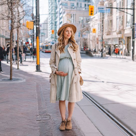 A spring trench adds instant polish to any maternity outfit.
