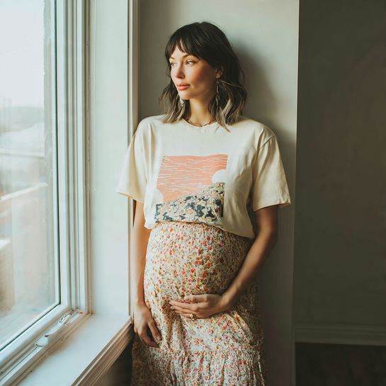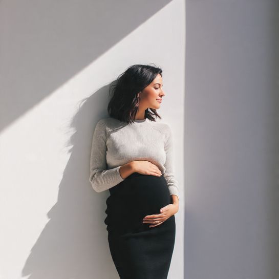 A high-waist midi skirt supports the bump while a soft cropped knit highlights it beautifully without feeling tight.