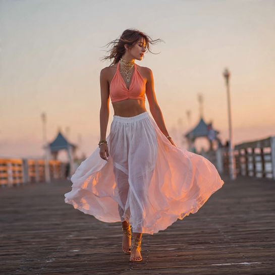 A halter top paired with a flowing maxi skirt creates beach goddess energy perfect for sunset strolls or outdoor dining.
