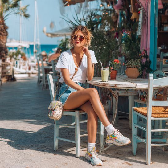 A classic denim mini skirt with a tucked graphic or plain tee is universally flattering and works anywhere from beaches to city streets.