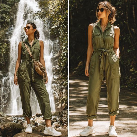 A sleeveless utility jumpsuit in khaki or olive offers safari-chic style perfect for exploring nature or urban jungles.