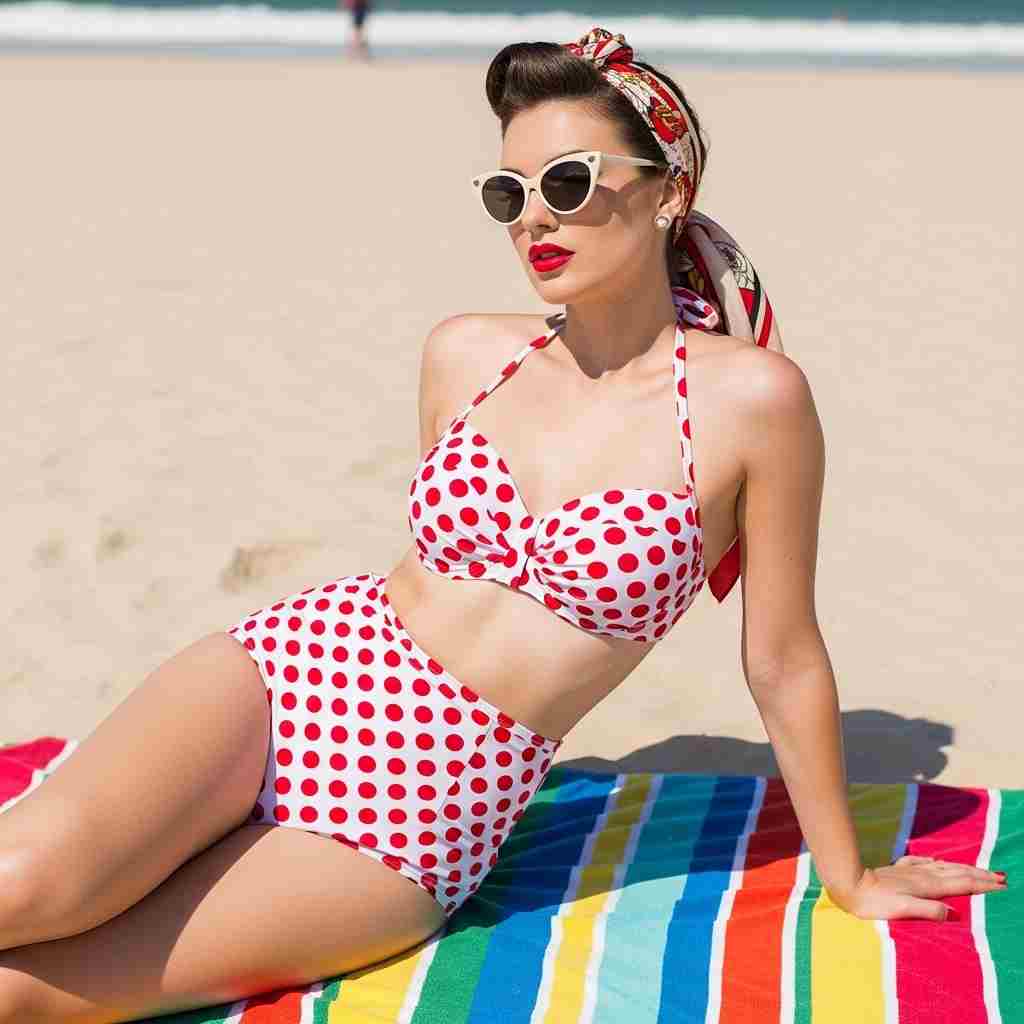 A high-waisted bikini in a vintage-inspired print channels retro glamour perfect for poolside posing and beach days.