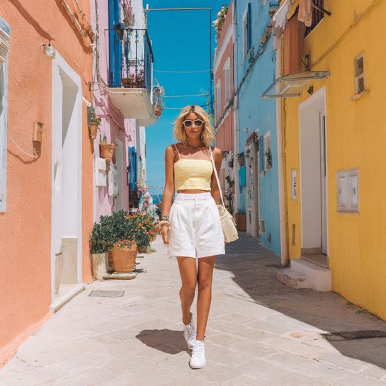 High-waisted linen shorts with a breezy crop top work equally well for beach towns and city exploring, offering comfort without sacrificing style.