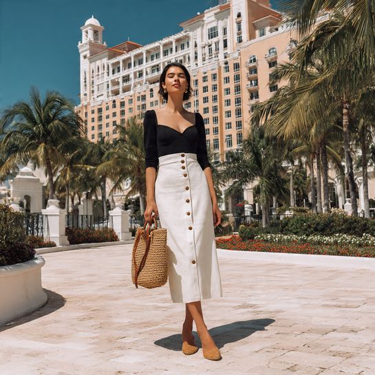 A linen button-front skirt with a fitted bodysuit creates polished casual perfect for upscale beach clubs or city boutique shopping.