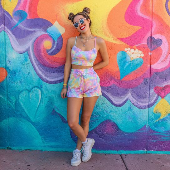 A matching tie-dye set brings playful color perfect for beach days or casual city exploring with festival vibes.