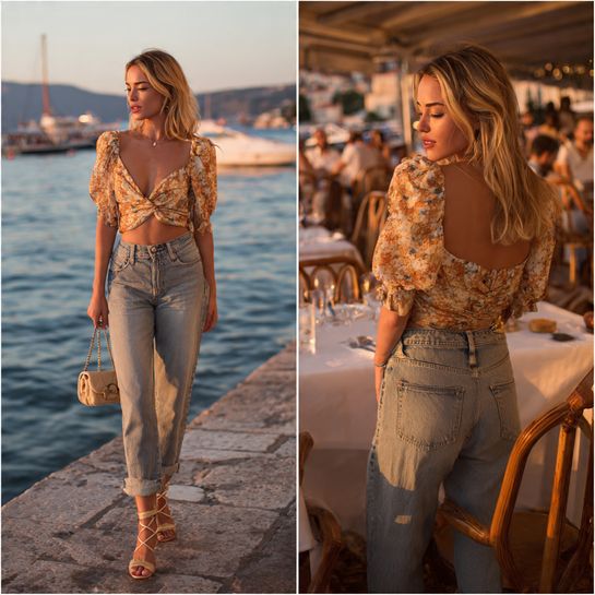 A wrap crop top with high-waisted jeans offers adjustable comfort and flattering fit for various body types and activities.
